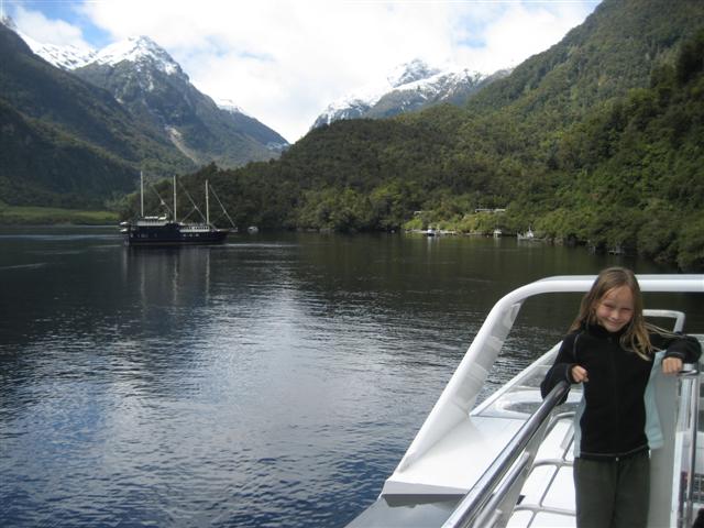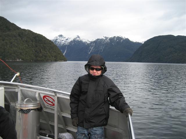 Vi tog en heldagsudflugt til Doubtful Sound. Her krydser vi Lake Manapouri.