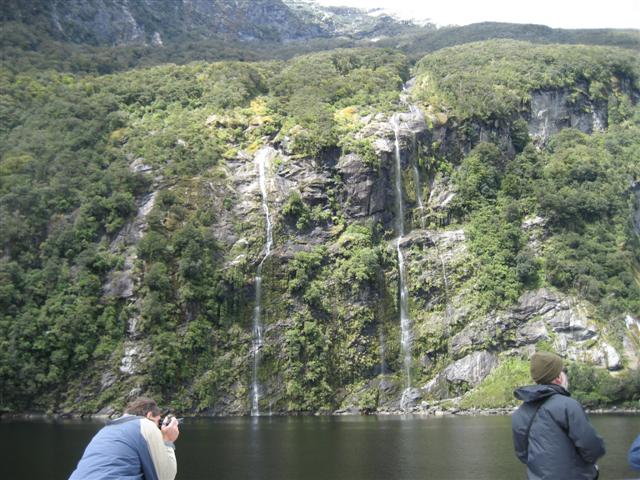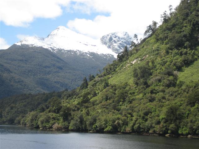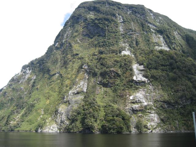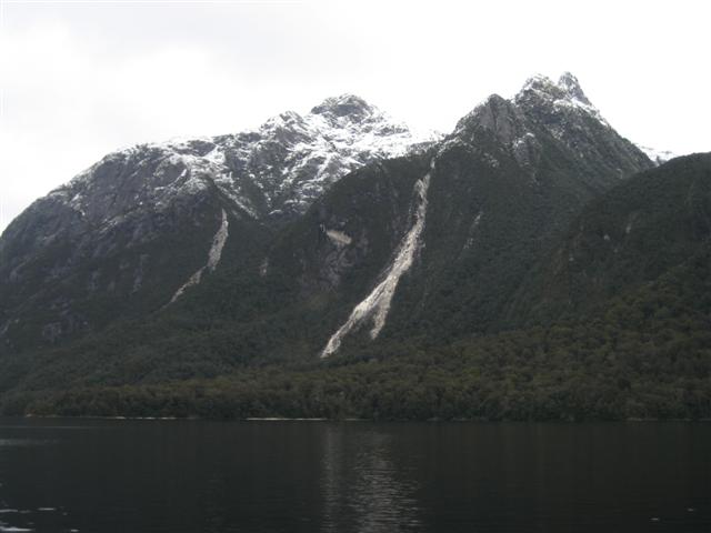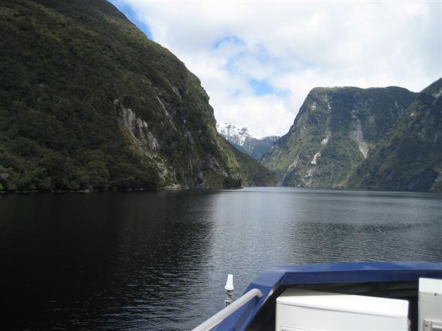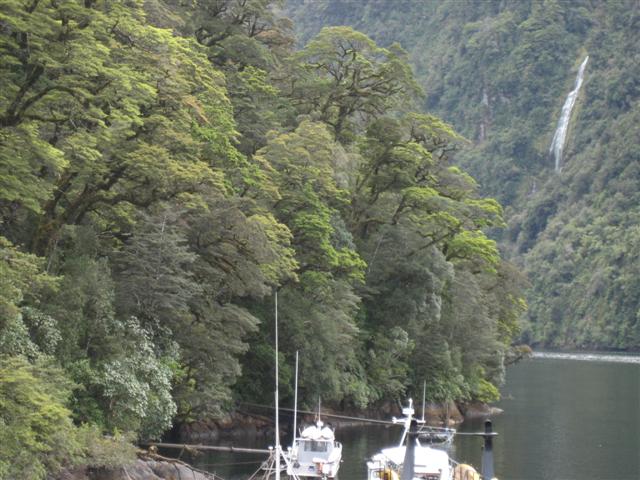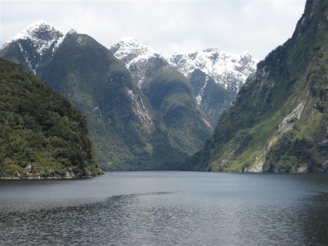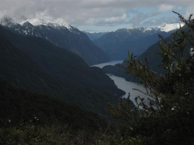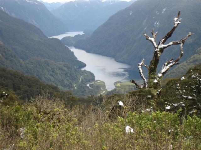 Doubtful Sound set på afstand. Utroligt flot med bratte bjerge på 1600m og 400m dyb fjord. Regnskoven er meget flot, 7m regn om året!
