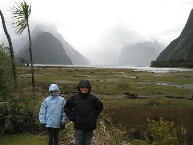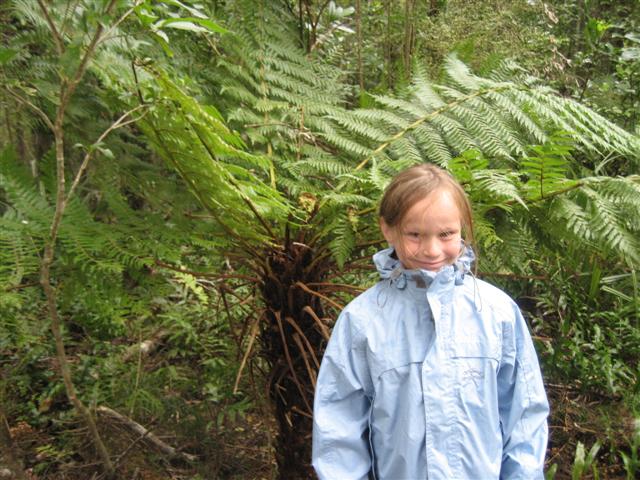 Milford Sound. Linnea ved træbregne. Det regnede meget i Milford, så udsigten var ikke så flot som da vi var i Doubtful Sound.