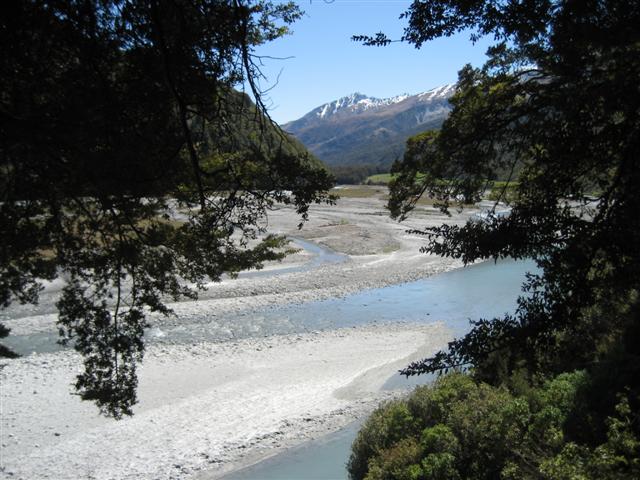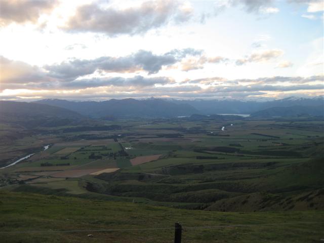 View from the top of Sams farm. Clutha River in the middle. Sams world extends to the line where the farmed fields start in the foreground.