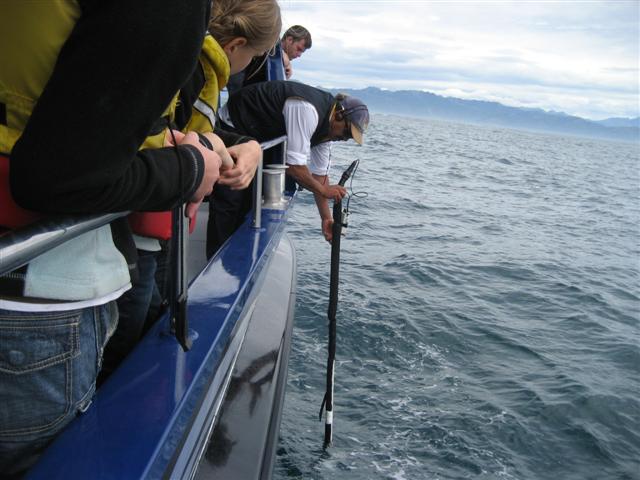 Vi venter på næste hval et sted der tidligere på dagen blev dykket. En hydrofon bruges til at lytte efter hvalens lyde. Den blev fundet!