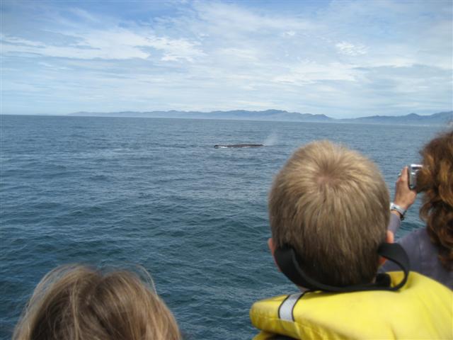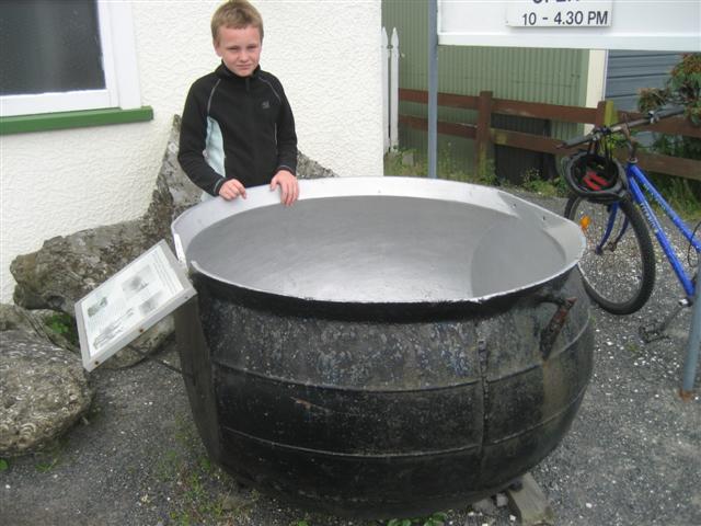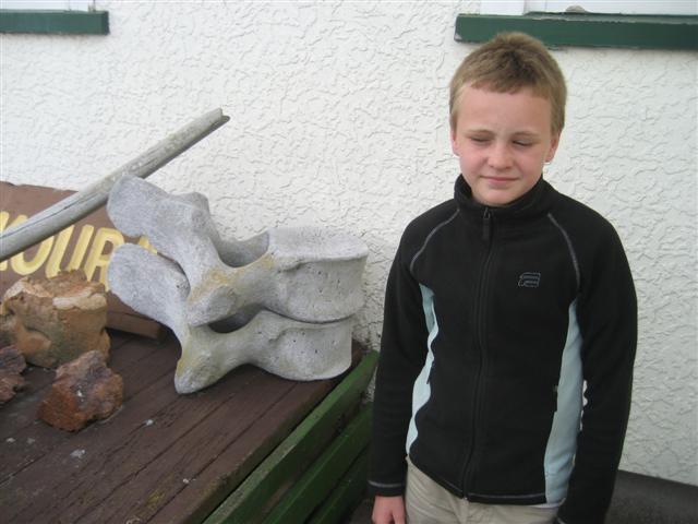 Vi gik på lokalmuseum i Kaikoura, hvor der var mange effekter fra fortiden som hvalfangerby. Her kæbeknogler fra hhv. spermacethval (tænder) og pukkelhval (den nederste). Dertil to barder fra pukkelhval.Ryghvirvler fra hval og stor gryde til smeltning af talg fra hvalspæk - eller "blubber" som det hedder på engelsk.