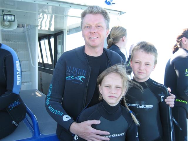 Her er vi klar med våddragter og udstyr. Båden blev entret på land og så sat i vandet.Der var ret hårdt vejr, og vi var kun selv i vandet i kort tid. Men der var hundredevis af delfiner lige under os, og de var kåde og klar til at vise deres kunster for hinanden (og for os).Linnea og Johan nåede i vandet, men det var ret koldt, og så var bølgerne lidt for store til de synes det var sjovt, men vi fik et super flot show...