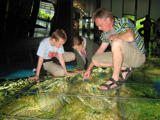 Blandt mange af de ting man kunne studere og også kravle ind i var et blåhvalshjerte. Og så var der et rum med kort over NZ i gulvet. Det blev studeret nøje - og vi tog lige turen på sydøen een gang til...