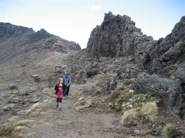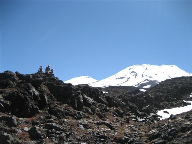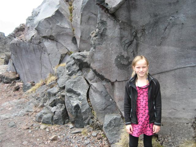 Her ved Whakapapa skiområdet på nordsiden af vulkanen. Der slappes af på en skibænk, før vi går videre. Og her er Linnea præcist, hvor Frodo og Sam i Mordor blev slæbt med i en kolonne ork-soldater.