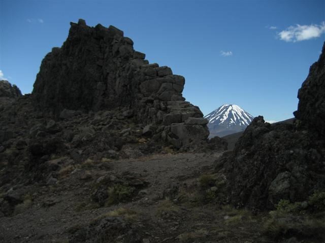 Meads Wall i Whakapapa skiområdet. Tynd lodret lavavæg på kanten af en dyb dal på bagsiden. Og flot udsigt til endnu en vulkan.