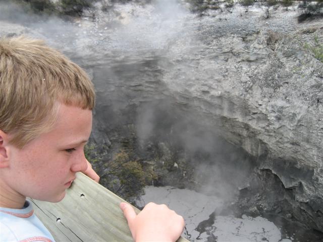 Johan ser ikke helt ud til at nyde lugten ved "djævelens blækhus" (næste sort kogende mudder).