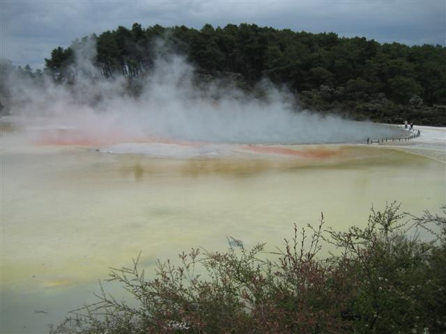 Det syder af fusel og bobler af gær... måske ikke lige gær, men føj for en stank!Stinkende, kogende vand, svovl-dampe, arsenik og bly-salte, geysere, kogende vand med sodavandsbrus. Men flotte farver i vandet og på klipperne. De har det hele i Wai-o-tapi og mere til. Godt man ikke også kan "tage" "billede" af lugt!!!