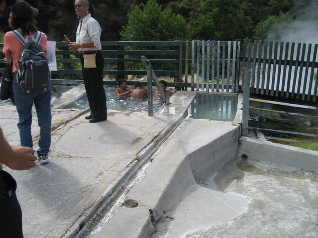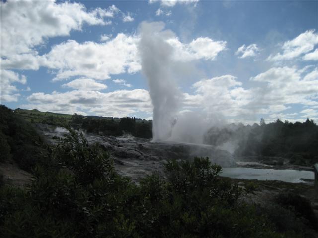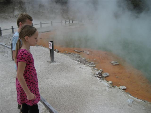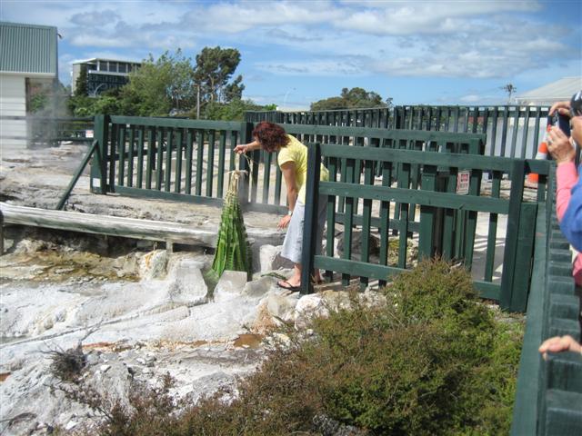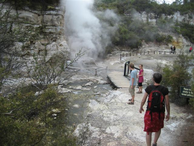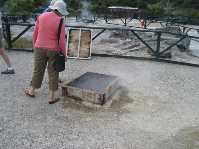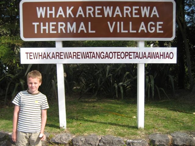 En Maori landsby med et lidt langt navn; godt der kun boede 26 familier. Det øverste skilt er det afkortede navn... Deres geyser sprang et par gange i timen.Fælles udekøkken med naturlig steambox (160grader) og kæmpegryde, 4m bred, 17m dyb, 96grader...